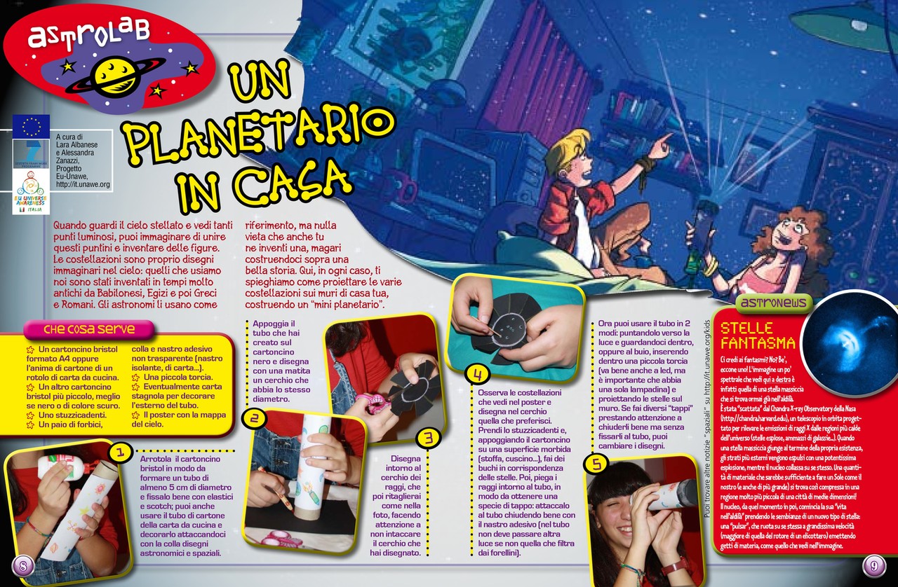 Dalla rivista Focus Junior (n. 110 Gruner+Jahr/Mondadori Direttore responsabile Vittorio E. Orlando) tutte le istruzioni per costruirsi un miniplanetario.