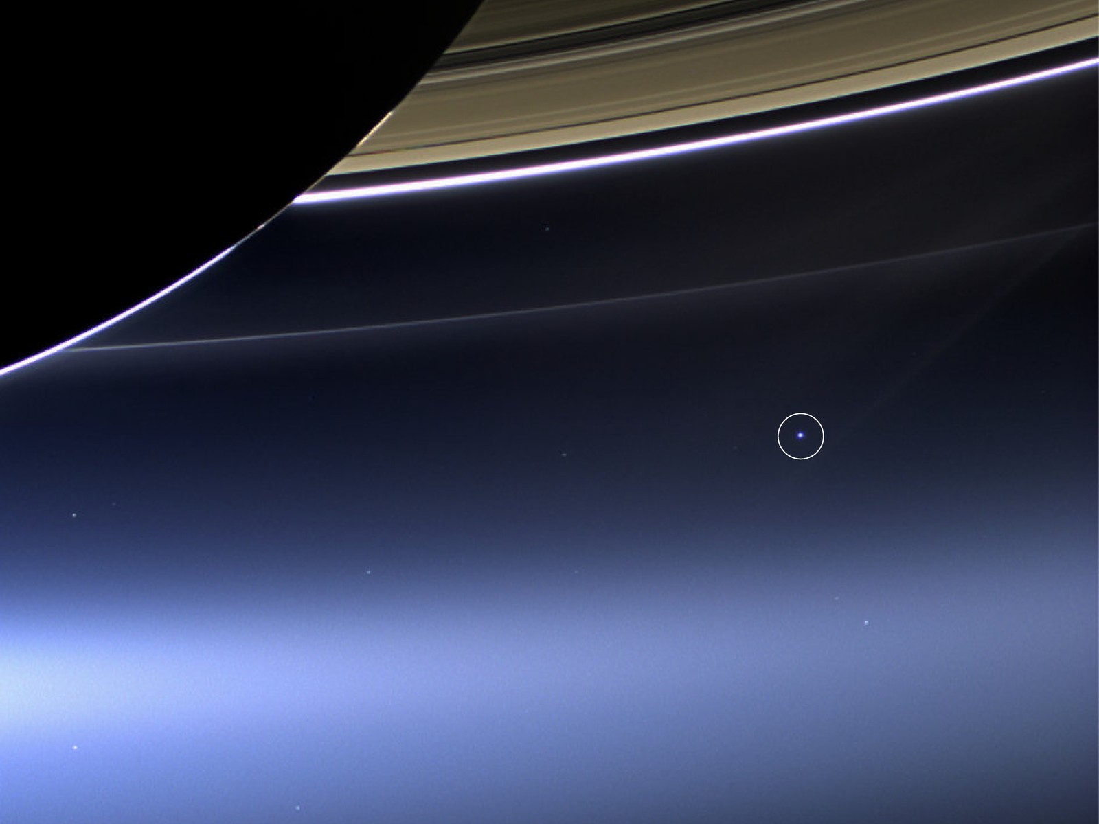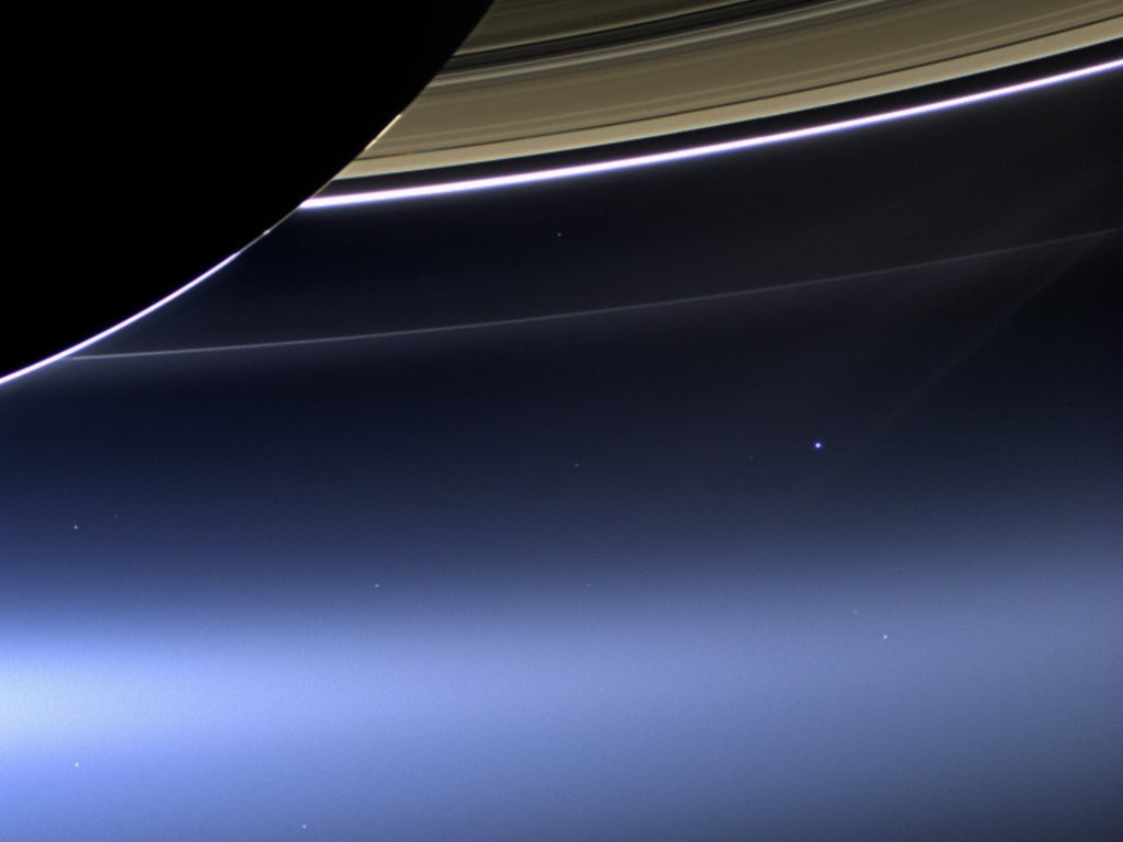 Il 19 luglio 2013 la sonda Cassini, in orbita attorno a Saturno, a più di un miliardo di chilometri di distanza da noi, si è voltata verso la Terra e le ha scattato una foto! L'istante dello scatto era stato calcolato con grande precisione in modo che la luce intensa del Sole fosse bloccata da Saturno. Il pianeta degli anelli si staglia grandissimo in primo piano, nella fotografia, con tutti suoi anelli, e la Terra non è altro che un puntino blu pallido molto lontano. Sembra piccolissima ma ci contiene tutti, noi miliardi di terrestri!