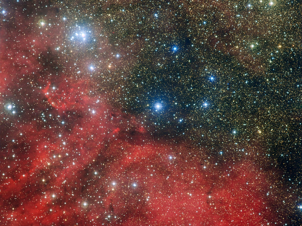 Dai un'occhiata a questa magnifica foto piena di stelle. Cosa attira il tuo sguardo? Il gruppo di stelle blu e bianche vicino al centro della foto, sulla sinistra? Si tratta di un giovane ammasso stellare con tantissime stelle molto calde.