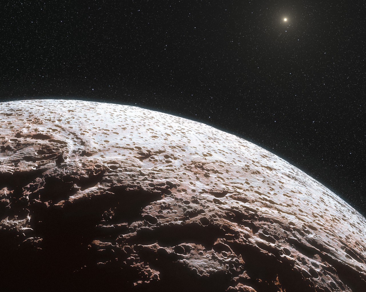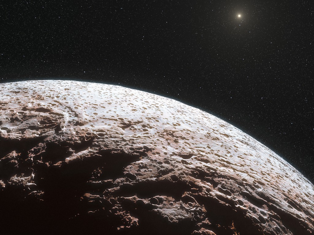 Sembra che Makemake, un pianeta nano del nostro Sistema solare, non abbia atmosfera. Insomma, è pelato! Per questo motivo non può neppure appigliarsi a quei due raggi di sole che riceve alla distanza a cui si trova, e cioè più lontano dal Sole di suo cugino Plutone.