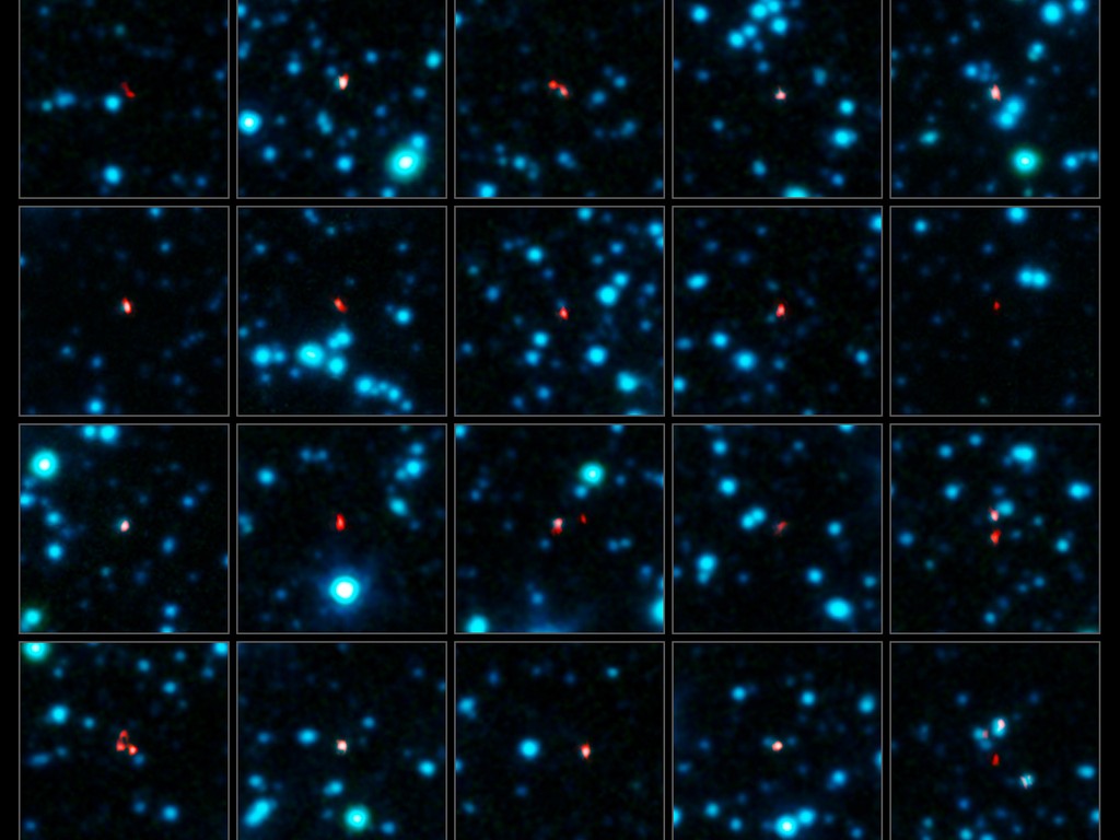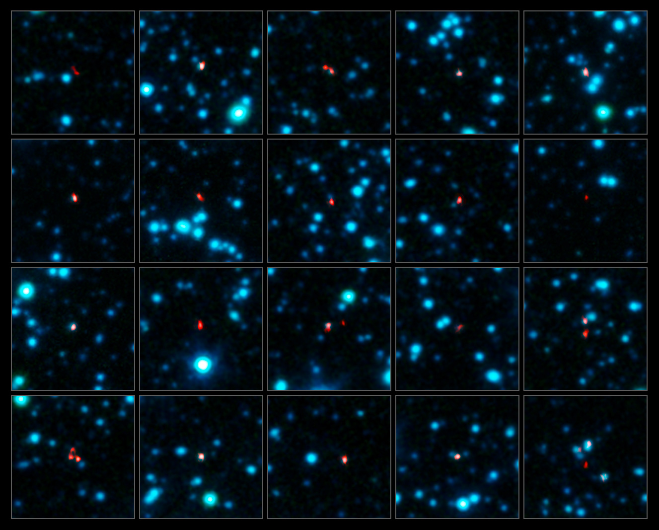 Il più grande boom di nascite di stelle si verificò quando l'Universo era ancora giovane, nelle galassie che contenevano una grandissima quantità di polvere cosmica. Purtroppo, la stessa polvere che fa queste galassie così fertili le oscura alla nostra vista, e rende molto difficile osservarle con i normali telescopi. Per più di 10 anni gli astronomi hanno cercato di osservare queste galassie giovani in fase di boom di nascite stellari. Adesso, a sole quattro settimane dalla sua entrata in azione, il telescopio speciale ALMA è riuscito a individuare più di 100 di queste galassie. Cioè più di quanto avessero mai trovato tutti gli altri telescopi messi assieme! In queste fotografie puoi vedere un po' delle galassie scoperte da ALMA.