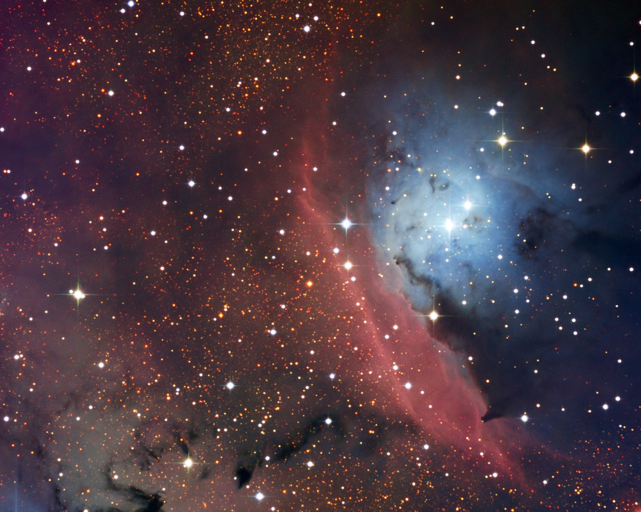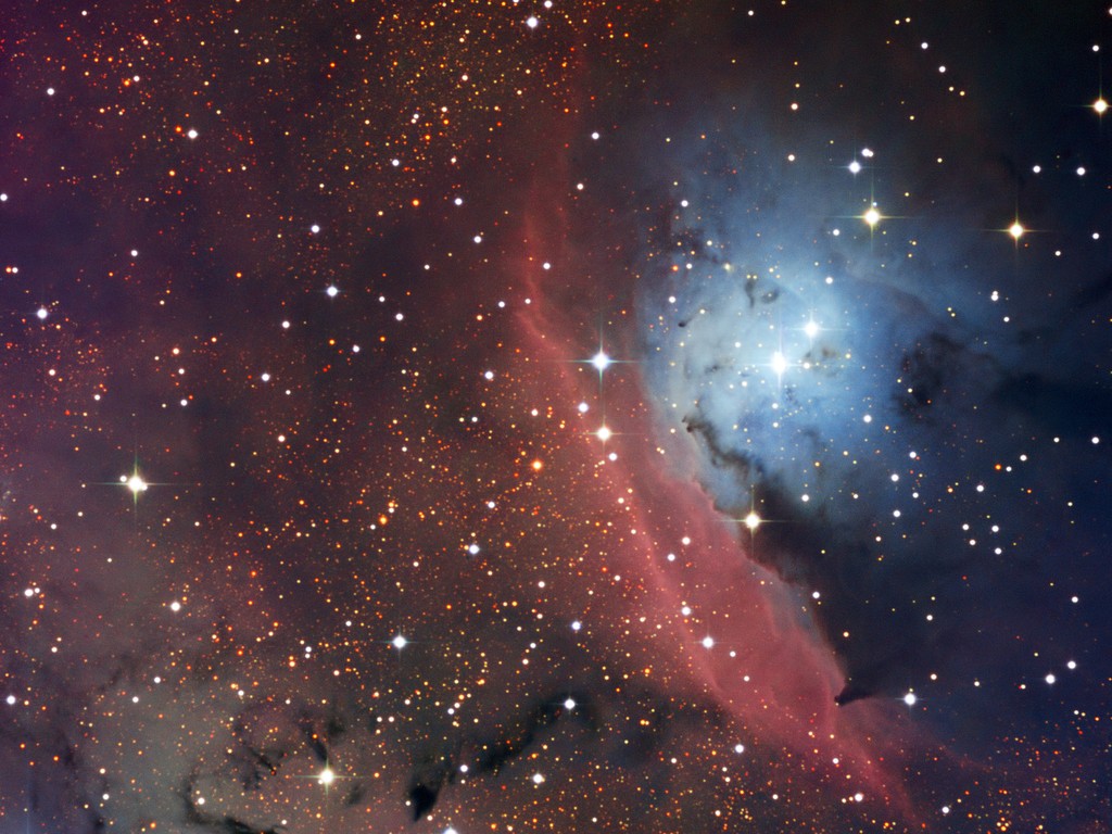 Nello spazio non esiste l'atmosfera. Questo vuol dire che non tira vento, non scende la pioggia e non c'è la neve... però ci sono le nuvole. Le nubi spaziali di gas e polvere si chiamano nebulose, o nebulae. E infatti "nebula" è una parola che in latino significa proprio "nuvola". Di queste nubi ne esiste una gran varietà: alcune sono resti di stelle ormai morte, altre - come questa - sono regioni in cui nascono tante stelle. In realtà, in questa nuovissima fotografia possiamo ammirare due tipi diversi di nebulose: una nebulosa a emissione e una a riflessione.