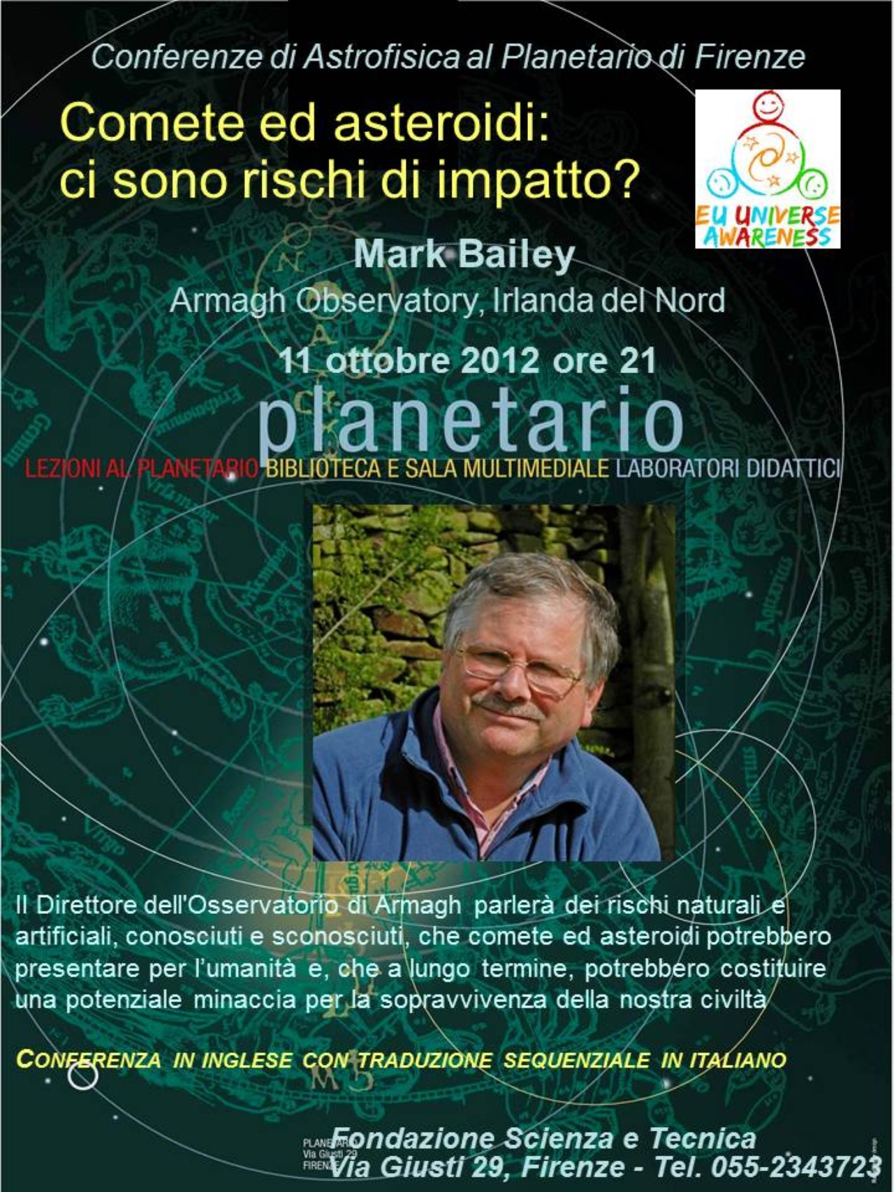 Il professor Mark Bailey direttore del prestigiosissimo Osservatorio di Armagh nell'Irlanda del Nord, partner del progetto EU-UNAWE, giovedì 11 ottobre 2012 alle ore 21 terrà una conferenza pubblica al Planetario di Firenze in via Giusti 29. Il titolo della conferenza è: "Comete ed asteroidi, ci sono rischi di impatto?". Si parlerà dei rischi naturali e artificiali, conosciuti e sconosciuti, che comete ed asteroidi potrebbero presentare per l'uomo. A lungo termine questi oggetti celesti costituiscono effettivamente una potenziale minaccia per la sopravvivenza della nostra civiltà!