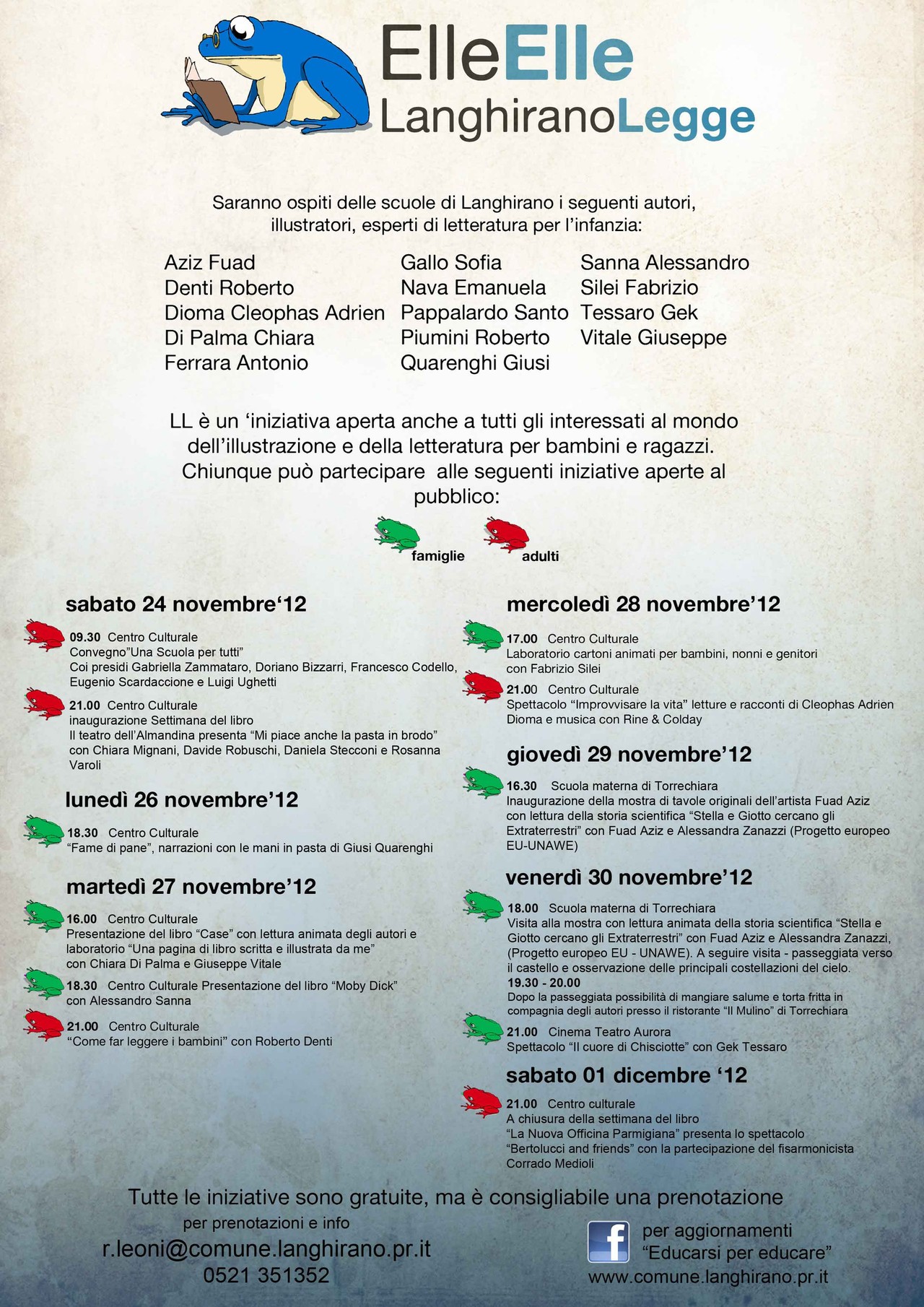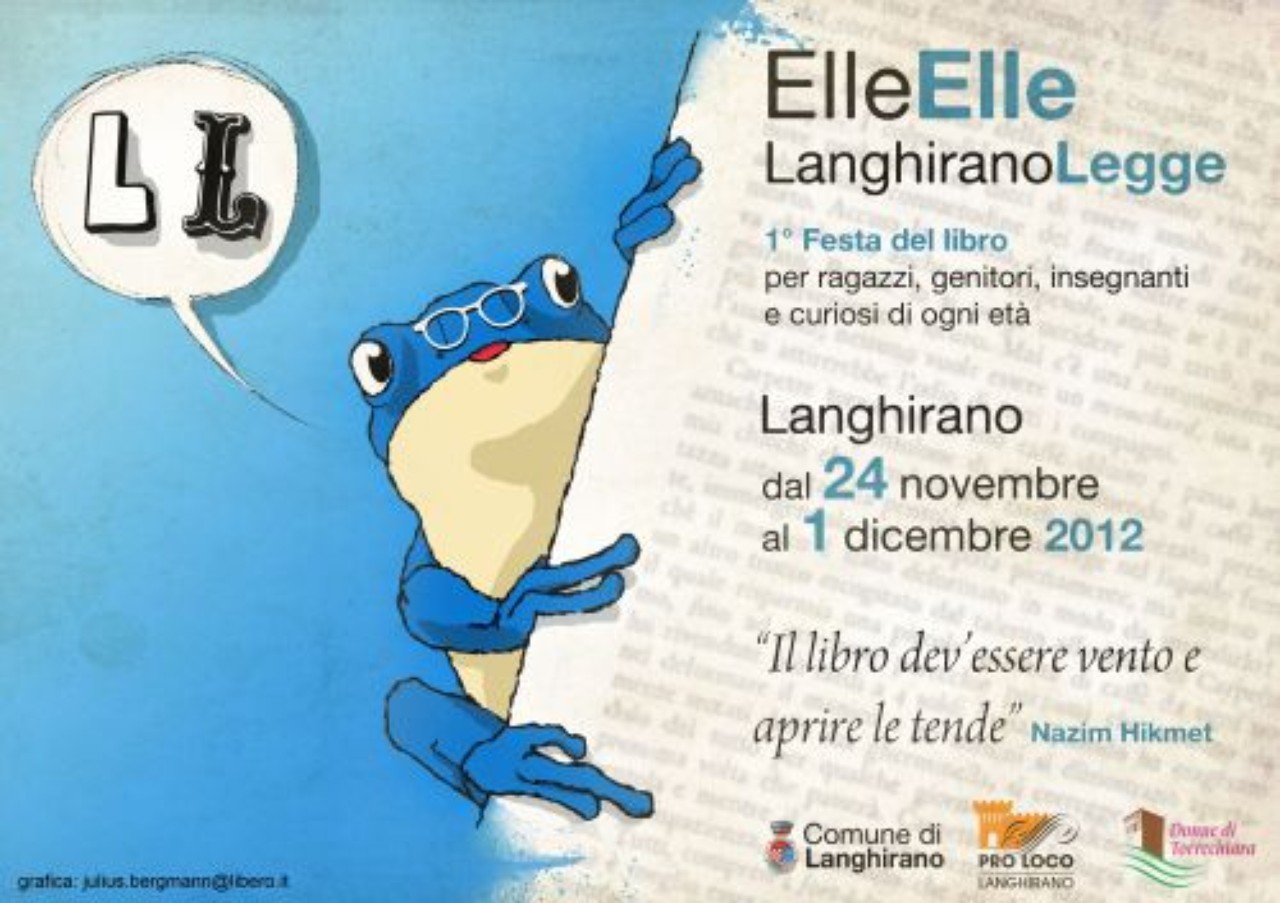 Dal 26 novembre al 1 dicembre l'Amministrazione Comunale di Langhirano organizza "LL Langhirano Legge"- settimana dedicata alla lettura e ai libri per ragazzi. La rassegna, che vede ospiti i più grandi autori e illustratori della letteratura per ragazzi, prevede iniziative per le scuole, corsi di aggiornamento per insegnanti, mostre, laboratori per bambini e ragazzi, spettacoli teatrali e letture per persone di tutte le età. EU-Unawe Italy partecipa con laboratori per i bambini della scuola dell'infanzia e con incontri di formazione per i docenti.
